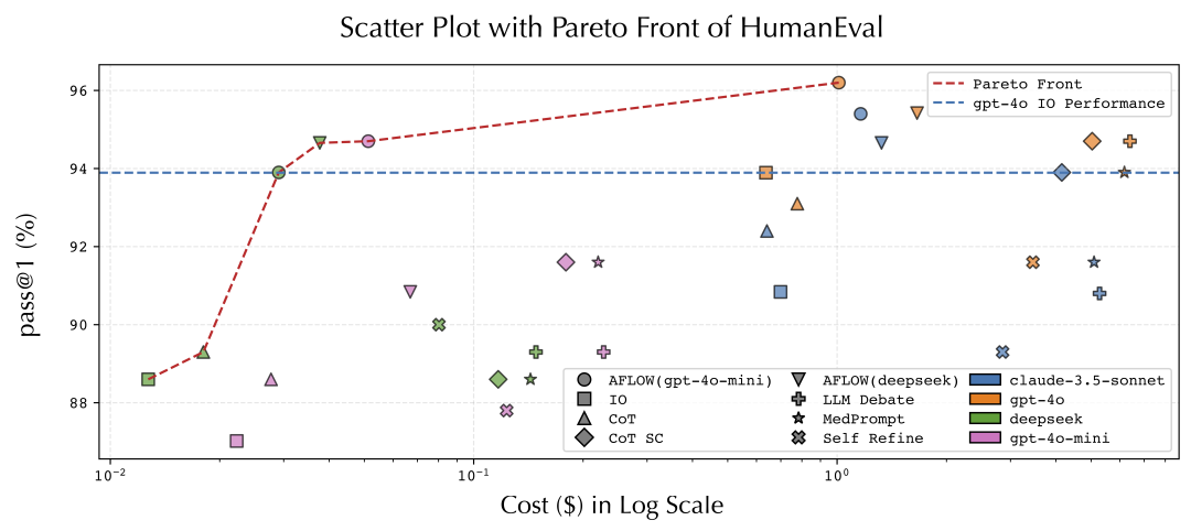 成本(Cost)指执行分割后 HumanEval 测试集的总费用。AFLOW(模型)指 AFLOW 使用该模型执行工作流,获得反馈。图例中的颜色代表在测试数据集中执行工作流所使用的不同 LLM
