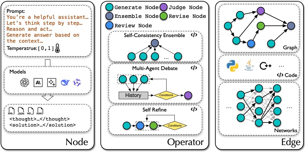 包含模型 M,提示 P,温度,输出格式 F(如 xml、json、markdown、raw)四个参数。节点通过边连接,边可以由各种结构表示,如图,神经网络,代码。