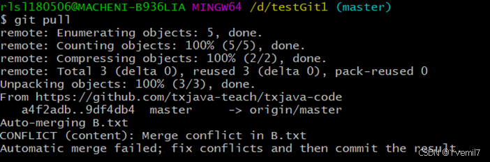 我提示中我们发现拉取成功,但是自动合并失败。git建议我们修改冲突后提交。