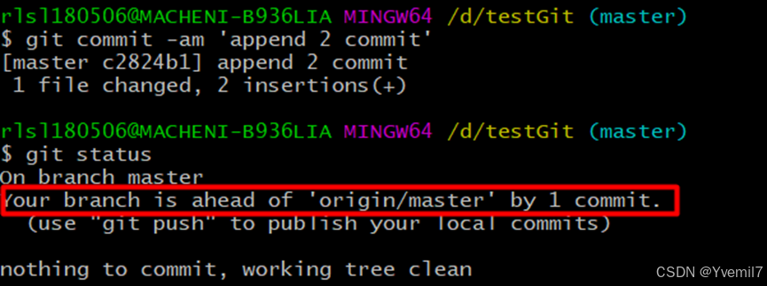 此时我们提交我们的修改后在查看git status,我们可以发现我们的本地master分支领先了1次提交。