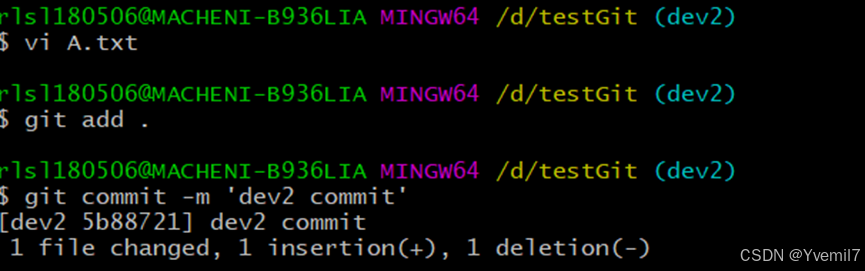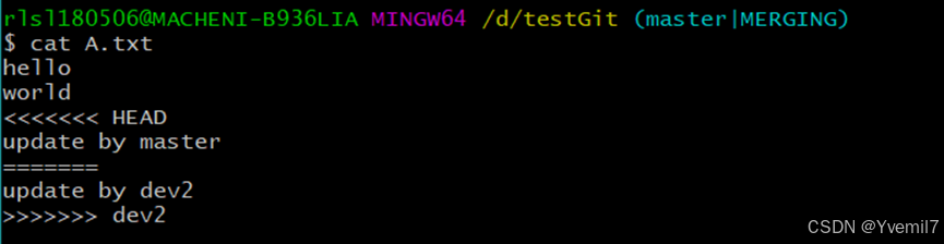 我们在dev2分支里面修改A.txt文件添加一行 update by dev2后提交