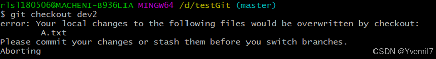 我们发现会提示错误,git建议我们先提交或者stash修改的内容再切换
