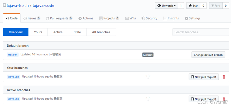 由于鲁智深已经推送,我们使用林冲的账户来拉取,我们可以看到新建立了分支