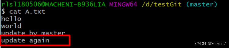 我们在master分支里面修改A.txt文件同时添加一行 update by master后提交