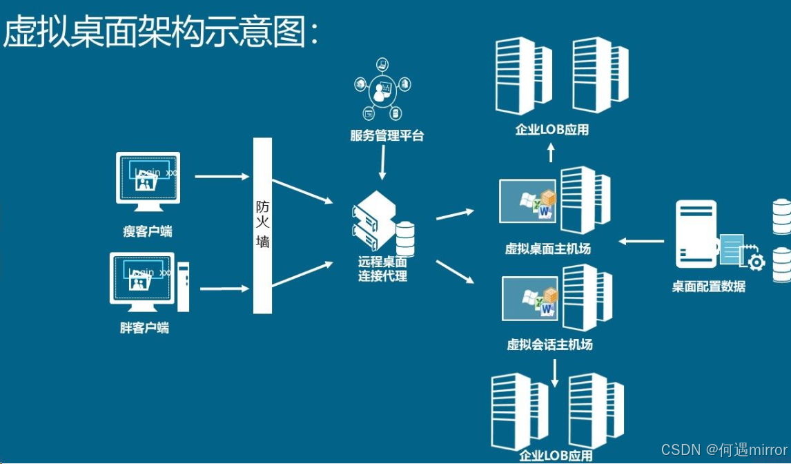 桌面虚拟化是将桌面操作系统及其应用程序运行在一个中央服务器上,并通过网络传输给终端用户的技术。终端设备可以是PC、笔记本电脑、平板电脑甚至是智能手机。