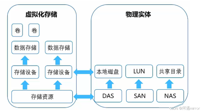 - 块级虚拟化:将物理磁盘空间抽象为逻辑卷(LUN),用户可以将其视为单独的磁盘驱动器。