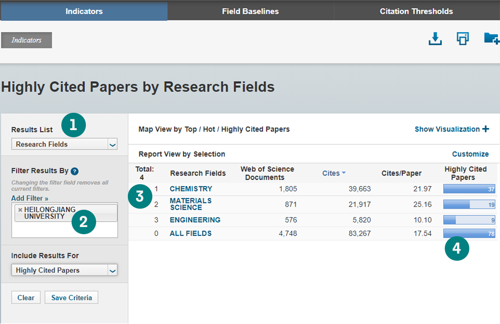 在结果区,从左至右依次显示了研究领域、论文数、被引频次、 篇均被引频次、高影响力论文、 高被引论文或热点论文的数量。