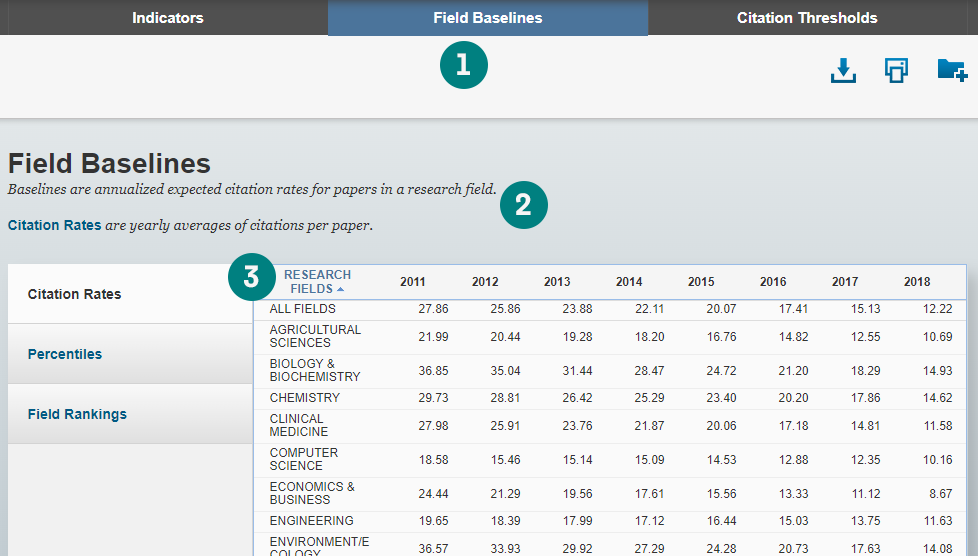 您可以选择 ESI 各学科所有机构的数据指标(Indicators)、基准值(Field Baseline) 或 ESI 阈 值 (CitationThresholds) 等不同数据类型