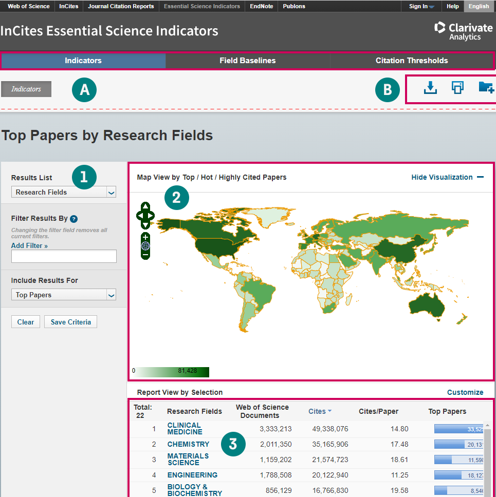 Essential Science IndicatorsTM ( 基本科学指标,简称ESI) 是一个基于 Web of ScienceTM 核心合集数据库的深度分析型研究工具。