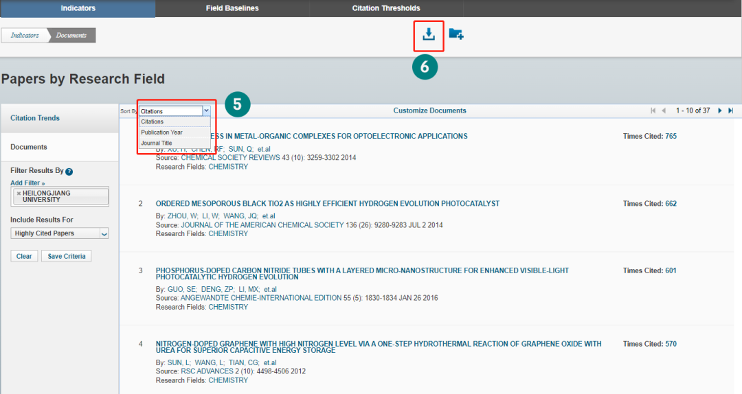 您还可以通过点击高被引论文或平均年指标旁边的倒三角标识,来对结果进行排序