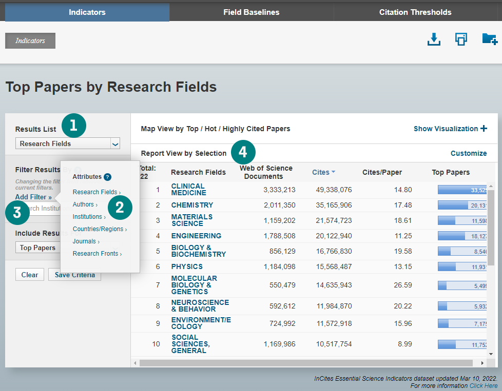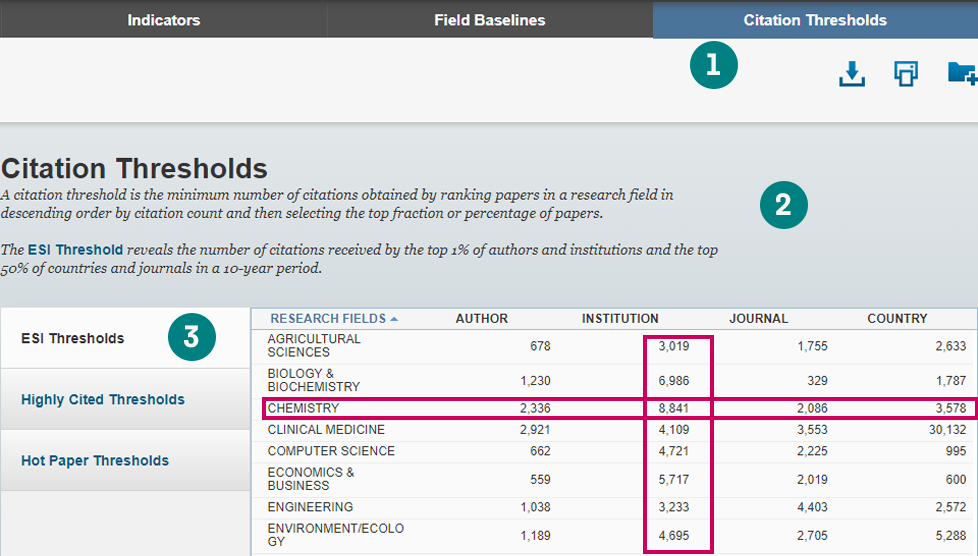 ESI 基于 Web of Science™ 大数据提供了一系列有意义的引文统计数据,也即引文阈值。这些统计数据可以帮助我们观察在不同发表年度和不同学科里论文的引文表现力。我们可以按照机构、作者、期刊、国家等不同角度进行对标分析。
