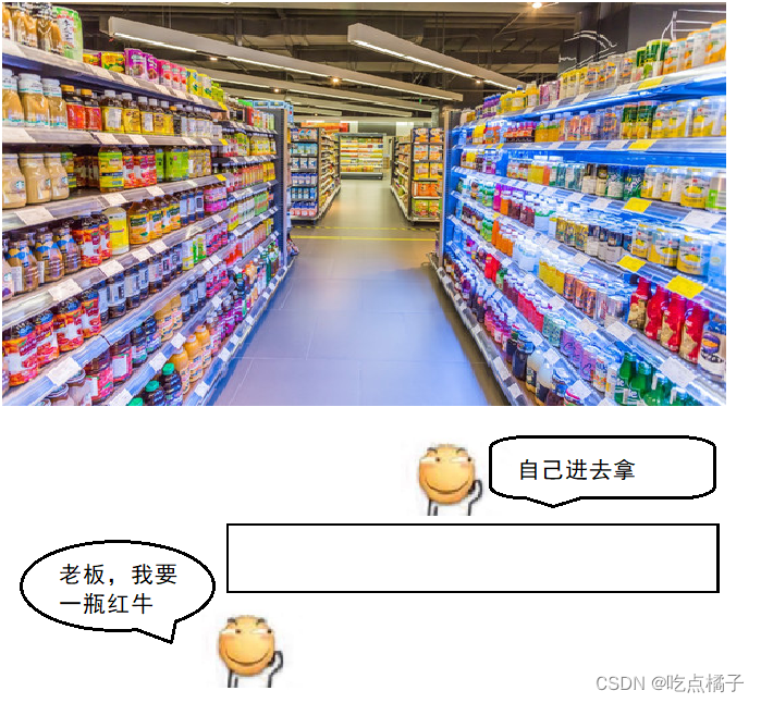 类似于我们去超市买东西:老板作为“生产者”,他把商品放在货物架上让我们自己拿,我们作为“消费者”,也不需要直接去找老板要商品,而是直接去相应的货物架上拿它就行,这个货物架就相当于“交易场所”。