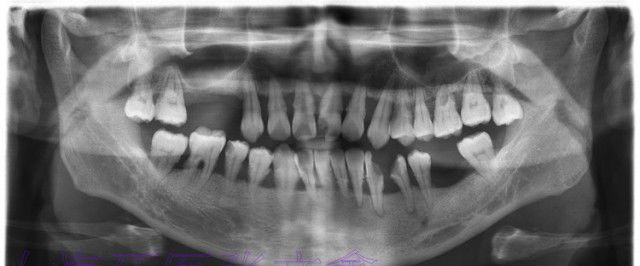 下面这张X光片是比较典型的牙周炎的X光片,该患者全口所有的牙齿都呈现出2~3度的松动。患者现在感觉无法用牙齿咀嚼。坦白地讲,牙周炎发展到这种程度,很多时候医生也束手无策了。为了保留更多的牙槽骨,医生会不得不拔掉那些严重松动的牙齿。
