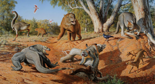 毫无疑问当土著居民成为第一批进入澳大利亚大陆的人类时,他们遇到了当时生活在这片土地上的大约24种巨型动物——体重超过100公斤的澳大利亚大型动物。除了一些较小的袋鼠外,所有这些动物都在过去的6万年里灭绝了。这种灭绝是在何时何地发生的呢?这场讨论的主要参与者之一是哺乳动物学家和环境历史学家Tim Flannery。他强烈主张澳大利亚最早的人类居民对环境造成了巨大的影响,是导致巨型动物灭绝的主要原因。他的复杂论点结合了各种各样的证据和假设,但一个简单的版本是:人类到达后,灭绝迅速接踵而至,至少部分原因是这些动物以前从未遇到过人类作为捕食者的情况,因此无知无畏,容易成为猎物。只有那些跑得足够快,能够逃脱土著居民追捕的物种——比如袋鼠和岩袋鼠,或者那些有其他保护方式的物种——比如会爬树的考拉或住在洞穴里的袋熊——幸存了下来。