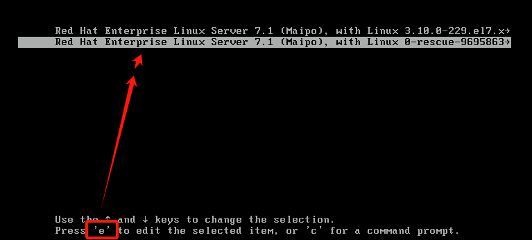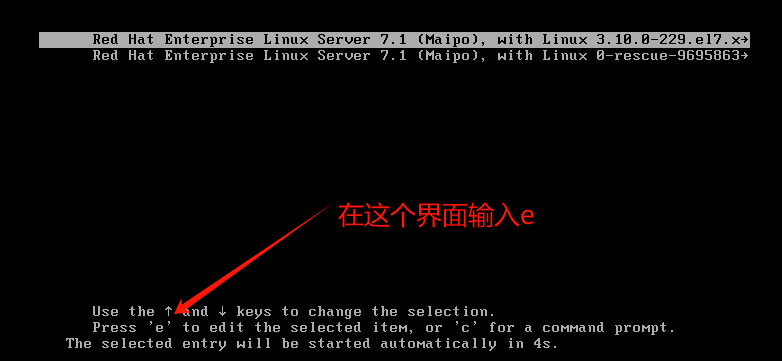 这里选择第一项或者第二项都可以(这里的区别是,第一项进去,在更改密码的时候,看到的密码更改提示是加密显示,第二项进去,在更改密码的时候,看到的密码更改提示是明文形式)。然后按 e 进入紧急模式(以前的版本叫做单用户模式)