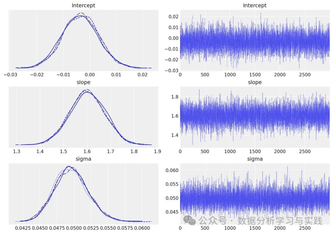 讯享网with pm.Model() as model_capm: # 定义先验分布sigma = pm.HalfCauchy(‘sigma’, beta=10)intercept = pm.Normal(‘Intercept’, 0, sigma=20)slope = pm.Normal(‘slope’, 0, sigma=20)# 定义似然函数likelihood = pm.Normal(‘asset_excess_return’, mu=intercept + slope * market_excess_return, sigma=sigma, observed=asset_excess_return)# 推断trace_capm = pm.sample(3000, return_inferencedata=True)# traceaz.plot_trace(trace_capm, figsize=(10, 7))plt.show()