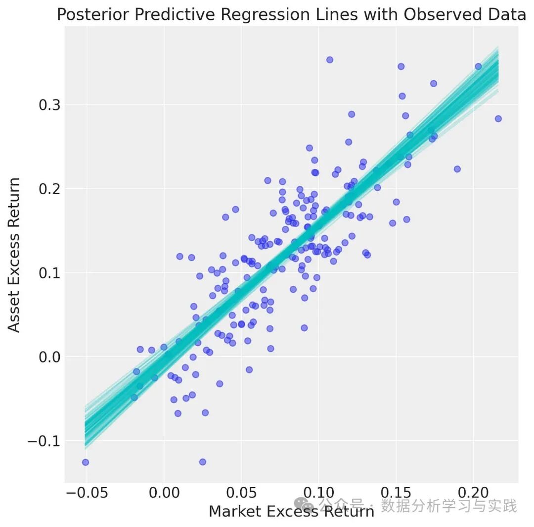 该模型使用观察到的数据(市场超额收益和资产超额收益)来更新我们对参数(截距、斜率和 sigma)的信念。马尔可夫链蒙特卡罗(MCMC)等采样方法用于近似这些参数的后验分布。