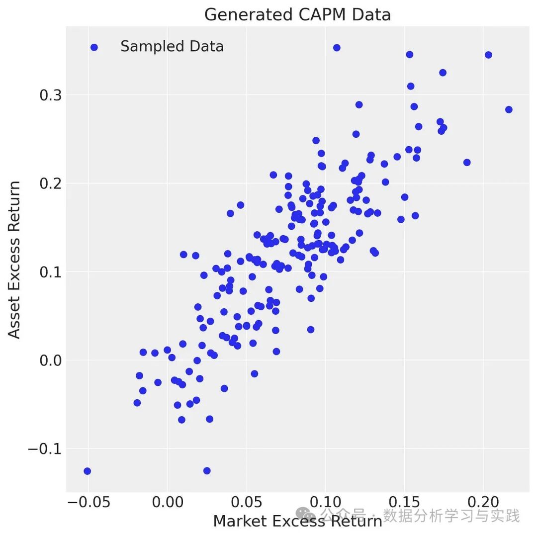 讯享网import pymc3 as pmimport arviz as azimport numpy as npimport pandas as pdimport matplotlib.pyplot as pltnp.random.seed(42) # 随机种子size = 200R_f = 0.02 # 无风险收益率E_R_m = 0.1 # 市场的预期收益beta = 1.5 # 投资的贝塔系数sigma = 0.05 # 残差# 生成市场收益 正态分布E_R_m_samples = np.random.normal(E_R_m, sigma, size)# 计算投资收益 CAPMepsilon = np.random.normal(0, sigma, size) # NoiseE_R_i_samples = R_f + beta * (E_R_m_samples - R_f) + epsilon # Asset returns# 生成贝叶斯回归数据market_excess_return = E_R_m_samples - R_f # 独立变量 (x)asset_excess_return = E_R_i_samples - R_f # (y)data_capm = pd.DataFrame(dict(market_excess_return=market_excess_return, asset_excess_return=asset_excess_return))# Plotplt.figure(figsize=(7, 7))plt.scatter(data_capm[‘market_excess_return’], data_capm[‘asset_excess_return’], label=‘Sampled Data’)plt.xlabel(‘Market Excess Return’)plt.ylabel(‘Asset Excess Return’)plt.title(‘Generated CAPM Data’)plt.legend()plt.show()