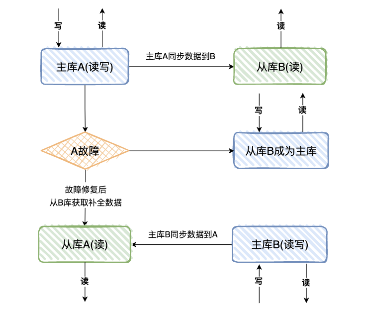 如果 A 库发生故障,B 库成为主库负责读写,修复故障后,A 成为从库,主库 B 同步数据到从库 A。
