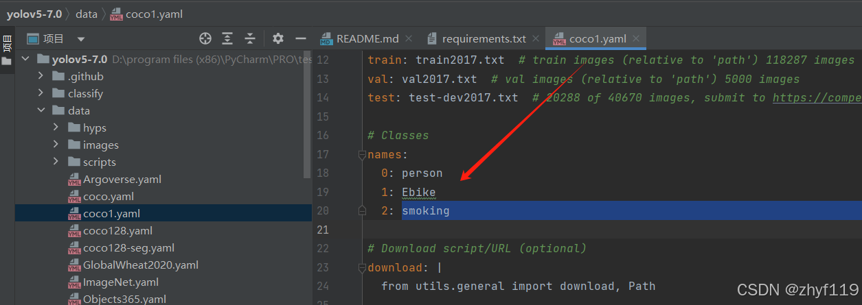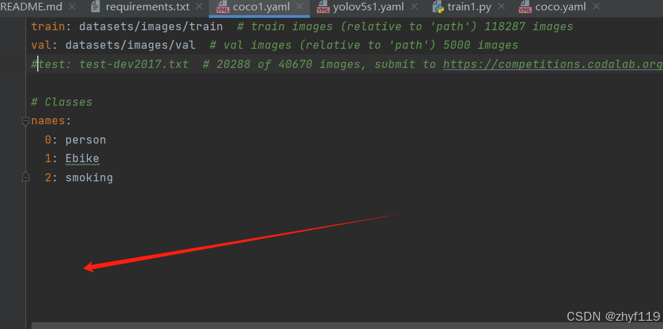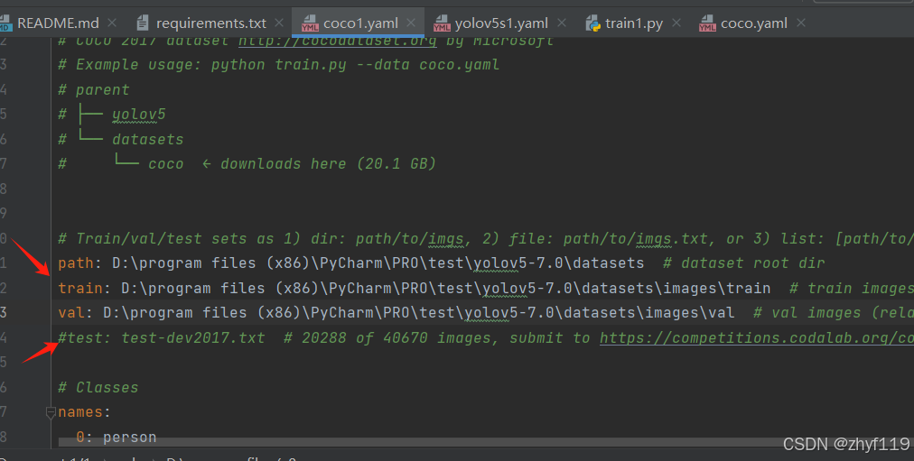 复制一份在原路径下为coco1.yaml并打开,修改类别名称,与”5、数据标注“中所打标签一致,不确定的话可以去save时保存的路径下找到classes.txt”文件。