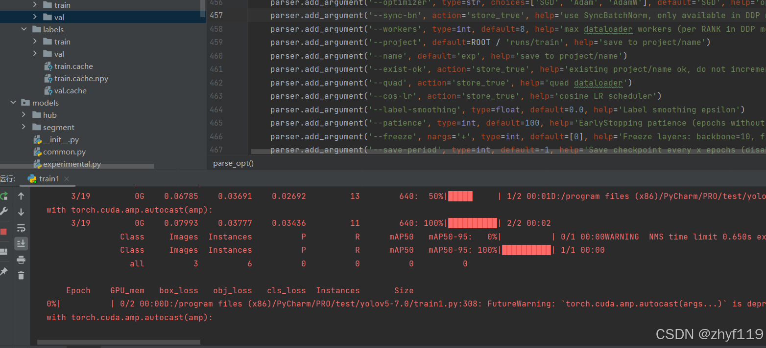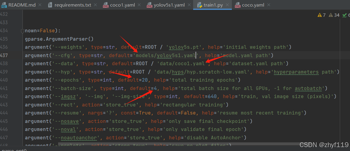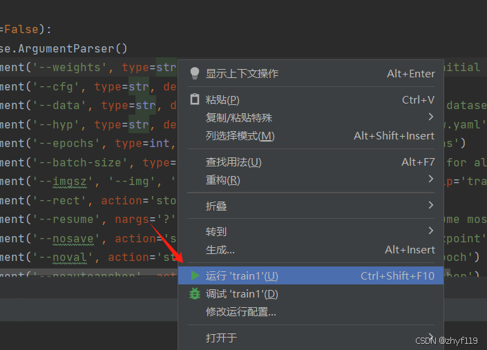 复制一份在原路径下为train1.py并打开,在下方主函数处进行参数配置,根据本机情况配置修改即可,用CPU在跑,所以将”训练迭代轮数“、”训练批量大小“都调小了。