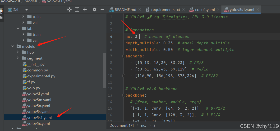 复制一份在原路径下为yolov5s1.yaml并打开,修改第1行nc(类别数量)为 3【注意:”5、数据标注“中分几类就修改为几】。