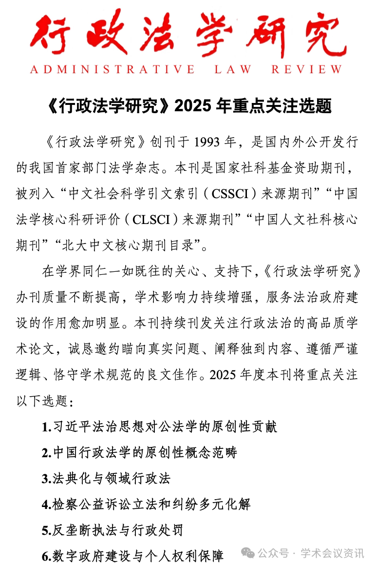 《行政法学研究》创刊于1993年,是由中华人民共和国教育部主管、中国政法大学主办、《行政法学研究》编辑部出版的国内外公开发行的我国首家部门法学杂志。本刊是国家社科基金资助期刊,已被列入“中国人文社科核心期刊”“法律类中文核心期刊”“中文社会科学引文索引(CSSCI)来源期刊”“中国法学核心科研评价(CLSCI)来源期刊”“中国社会科学期刊精品数据库来源期刊”“中国学术期刊综合评价数据库来源期刊”和“中国核心期刊(遴选)数据库”。