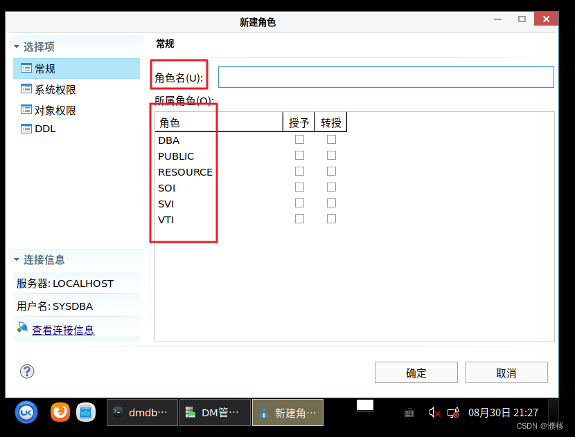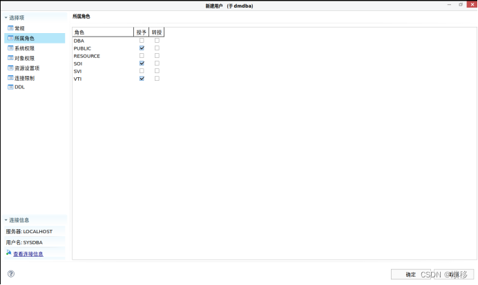 2.在此页面设置角色名称,也可以选择所属角色。角色的权限是可以赋予另一个角色的。默认的角色有DBA/PUBLIC/RESOURCE/SOI/SVI/VTI.