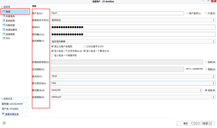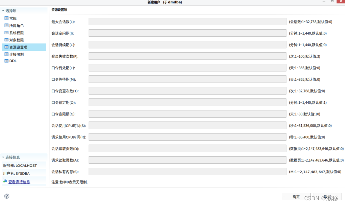 还需指定用户所属表空间、索引表空间、空间限制等,具体根据实际情况设定。