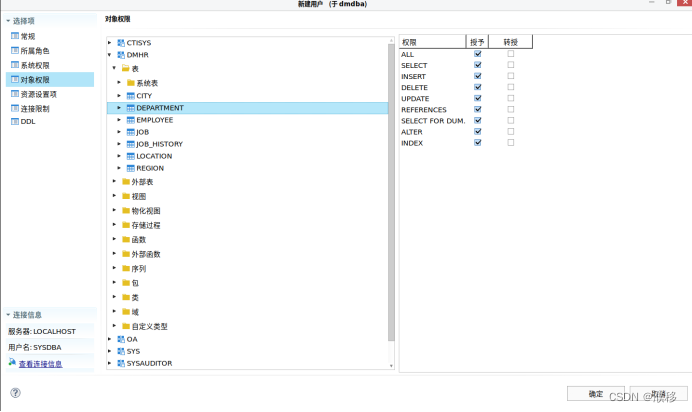 2.此页面可以设置对象权限,选择要设置的对象(模式、表、视图、函数、序列…….),对select,delete,update,alter等对象权限进行选择。