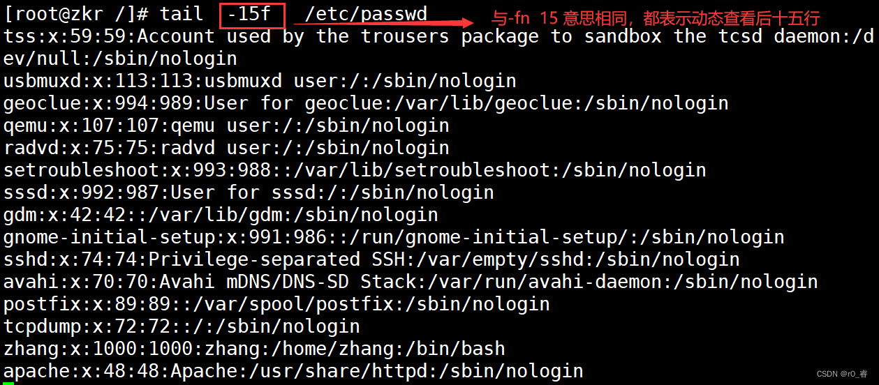 tail -fn 15 /etc/password