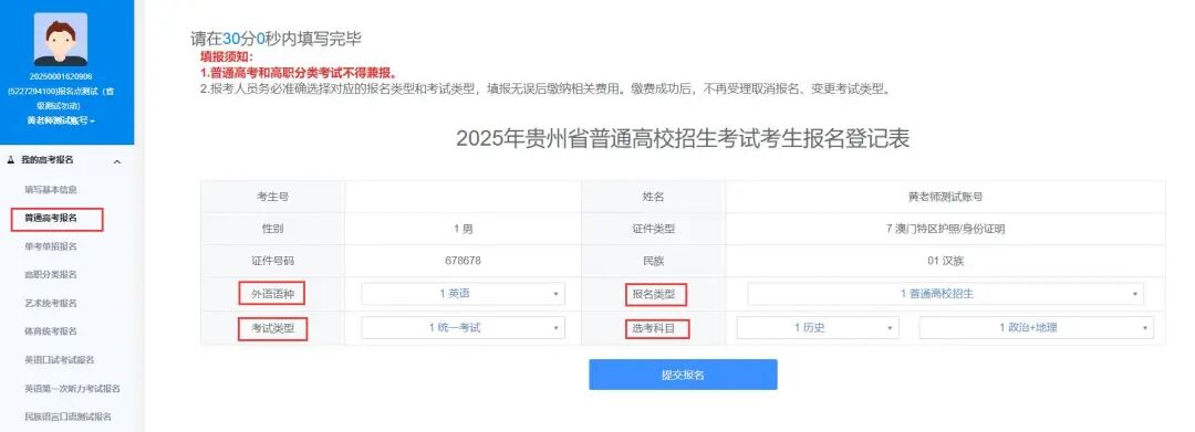 填写完成基本信息后,考生可开始填写报考信息。考生务必准确选择对应的报名类型和考试类型,填写无误后缴纳相关费用。本次报名,普通高考和高职分类考试不得兼报。