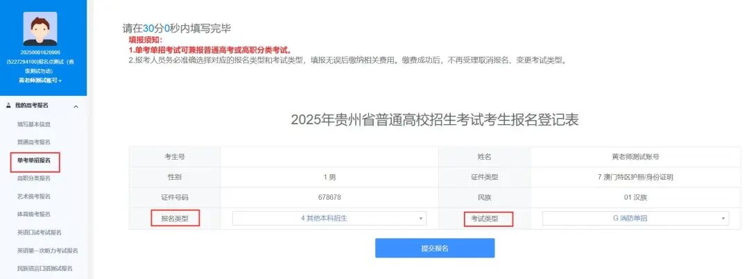 报考消防单招、职教师资考试、残障生单独考试、运动训练、武术与民族传统体育等单独招生的考生,进入【我的高考报名】->【单考单招报名】菜单,填报相关信息。