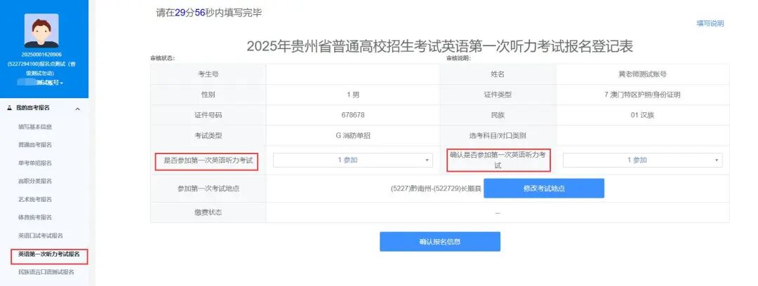报考英语第一次听力考试的考生,进入【我的高考报名】->【英语第一次听力考试报名】菜单,填报相关信息并线下缴费。