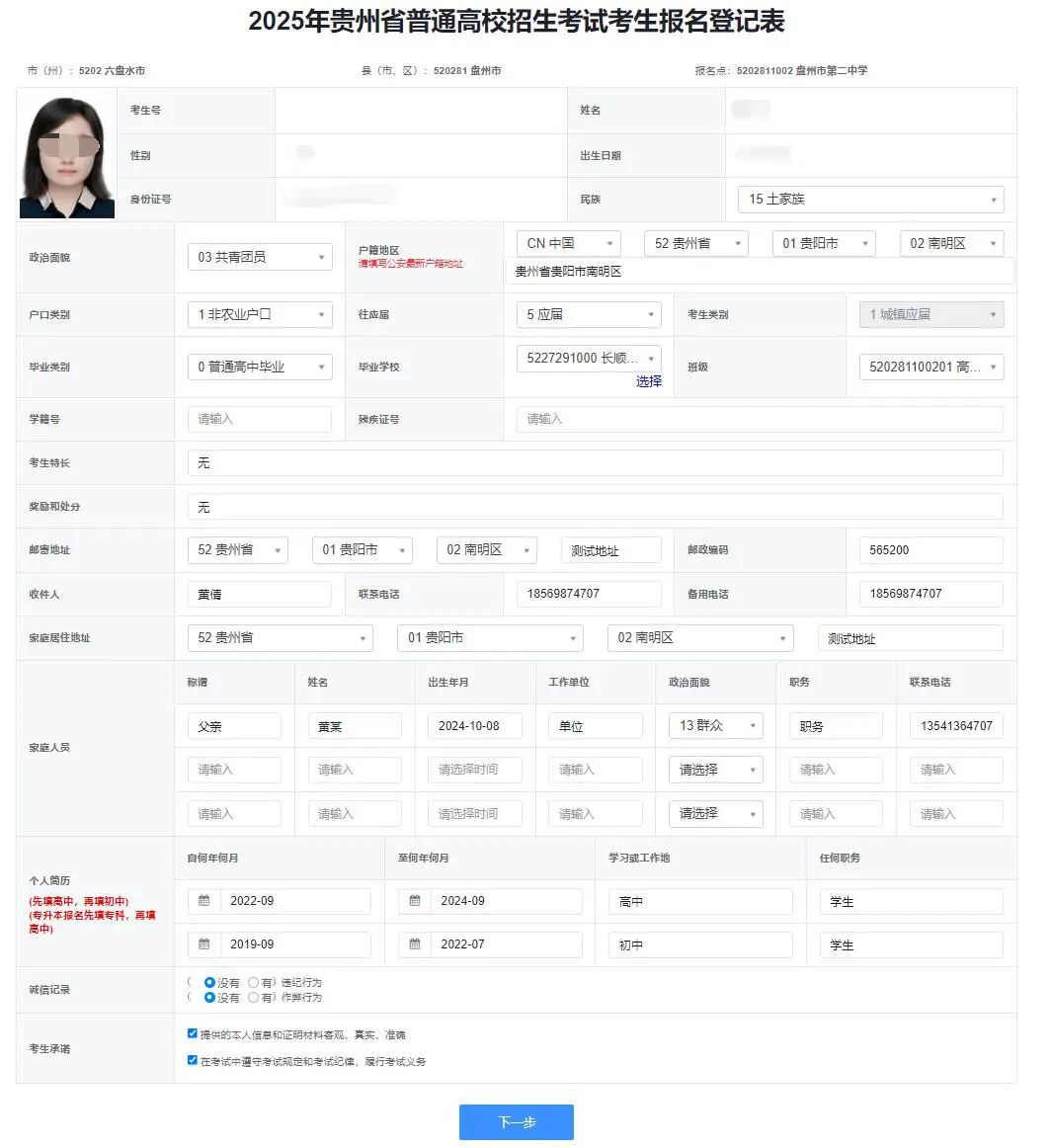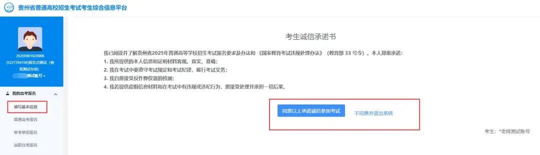 考生登录系统后,进入【我的高考报名】->【填写基本信息】,阅读并同意诚信承诺书,填写个人基本信息。