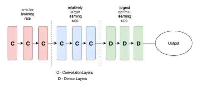 一般地,我们设计的神经网络(如下图)一般分为三个部分,输入层,隐含层和输出层,随着层数的增加,神经网络学习到的特征越抽象。因此,下图中的卷积层和全连接层的学习率也应该设置的不一样,一般来说,卷积层设置的学习率应该更低一些,而全连接层的学习率可以适当提高。