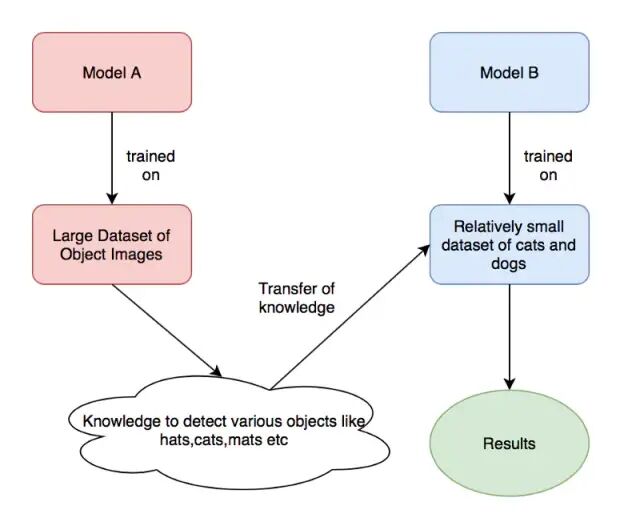 由上图,我们拿来「model A」训练好的模型权重去训练我们自己的模型权重(「Model B」),其中,modelA可能是ImageNet的预训练权重,而ModelB则是我们自己想要用来识别猫和狗的预训练权重。