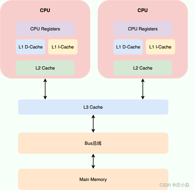 CPU Cache 的工作方式: 先复制一份数据到 CPU Cache 中,当 CPU 需要用到的时候就可以直接从 CPU Cache 中读取数据,当运算完成后,再将运算得到的数据写回 Main Memory 中。但是,这样存在内存缓存不一致性的问题 !比如我执行一个 i++ 操作的话,如果两个线程同时执行的话,假设两个线程从 CPU Cache 中读取的 i=1,两个线程做了 1++ 运算完之后再写回 Main Memory 之后 i=2,而正确结果应该是 i=3。