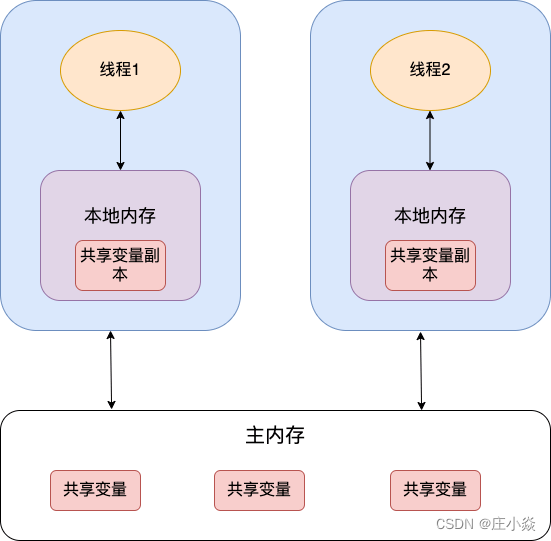 - 主内存 :所有线程创建的实例对象都存放在主内存中,不管该实例对象是成员变量还是方法中的本地变量(也称局部变量)