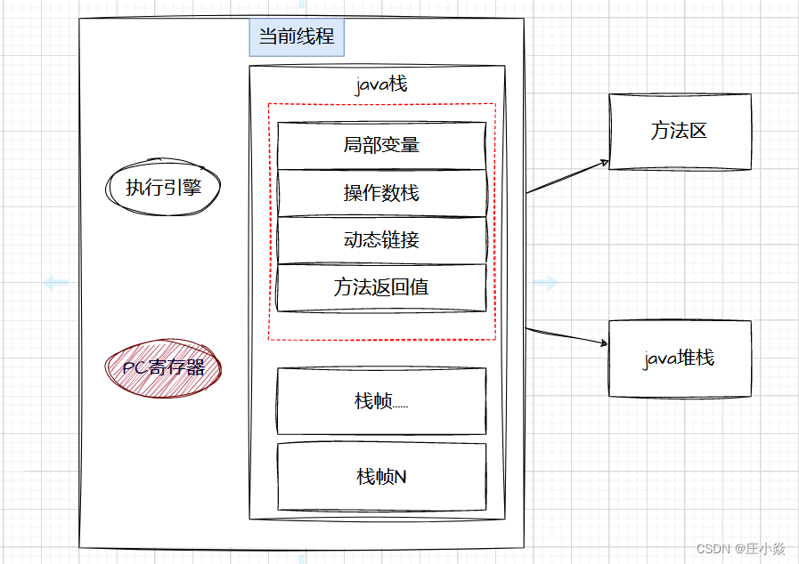 - 在一条活动线程中,一个时间点上,只会有一个活动的栈帧。即只有当前正在执行的方法的栈帧(栈顶栈帧)是有效的,这个栈帧被称为当前栈帧(Current Frame),与当前栈帧对应的方法就是当前方法(Current Frame)。