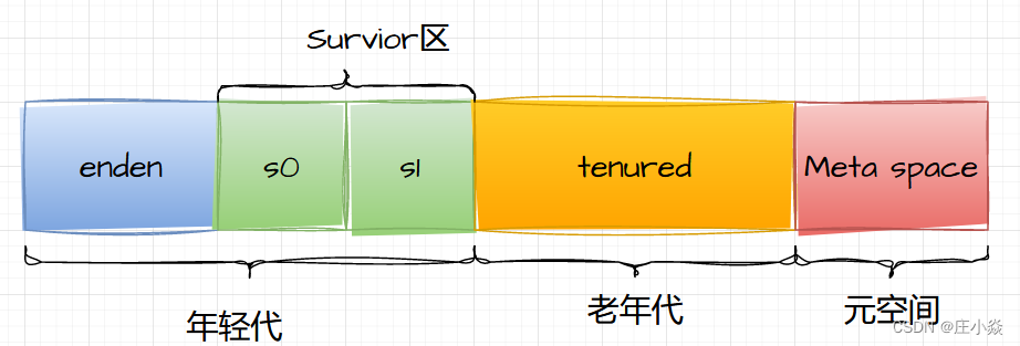 - Young Generation Space 新生区 Young/New 又被划分为 Eden 区和 Survivor 区