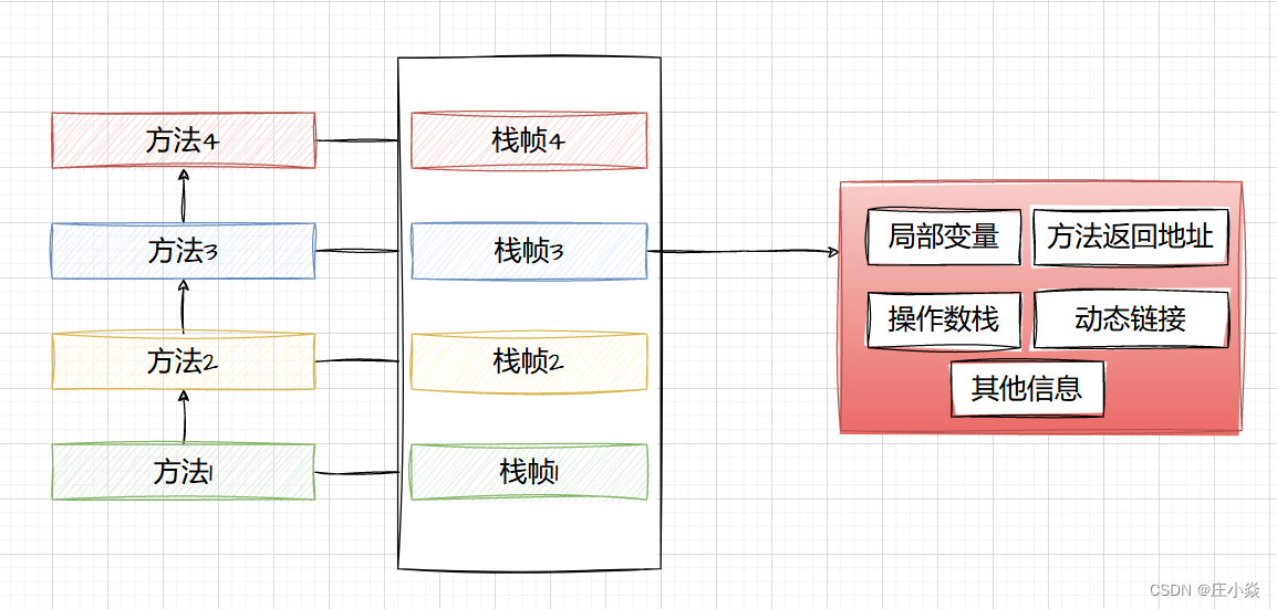 java虚拟机栈,早期也叫Java栈。 每个线程在创建时都会创建一个虚拟机栈,其内部保存一个个的栈帧(Stack Frame),对应这个一次次的java方法调用。它是线程私有的。生命周期和线程是一致的。作用:主管java程序的运行,它保存方法的局部变量(8种基本数据类型、对象的引用地址)、部分结果,并参与方法的调用和返回。局部变量:相对于成员变量(或属性)基本数据变量: 相对于引用类型变量(类,数组,接口)。