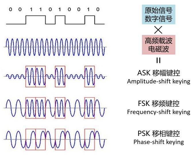 看出来了没?0和1,被“调”进了不同的电磁波波形之中。