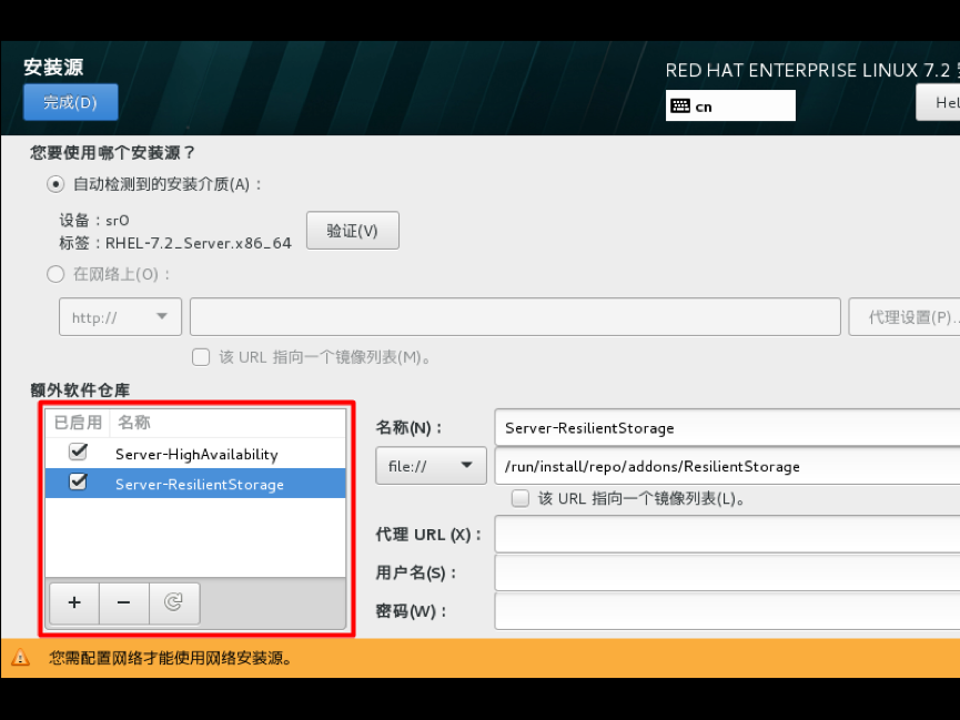 选择额外软件仓库,可以在安装时检测是否有更新的软件包,进行更新安装,如果没有也可以手动添加新的网络仓库,然后单击完成按钮