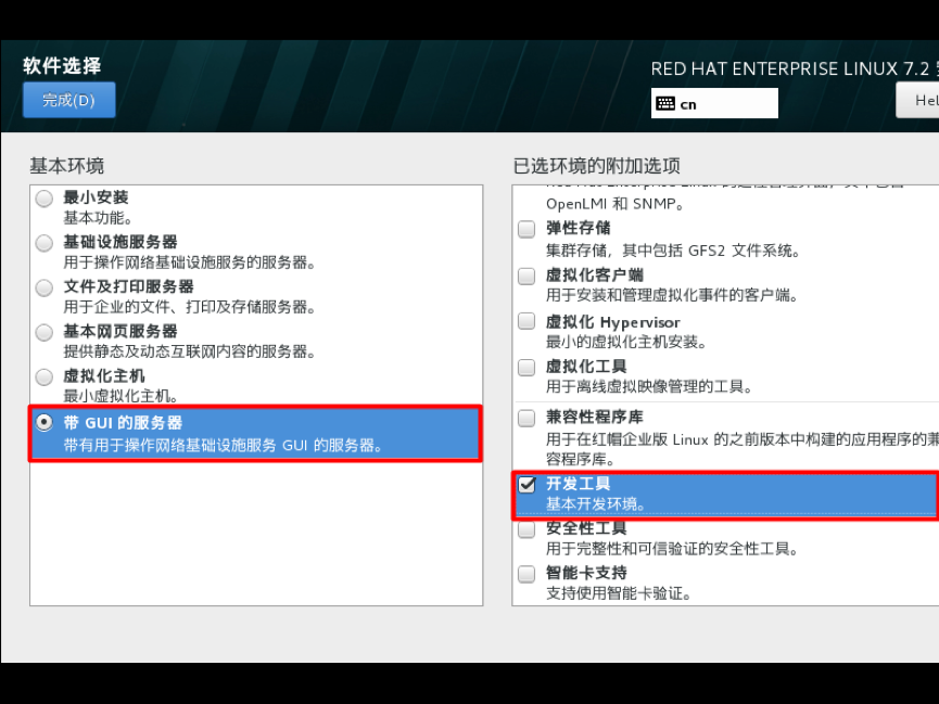 初学者建议选择带GNOME桌面,同时把开发工具相关的软件包也安装上,然后单击完成