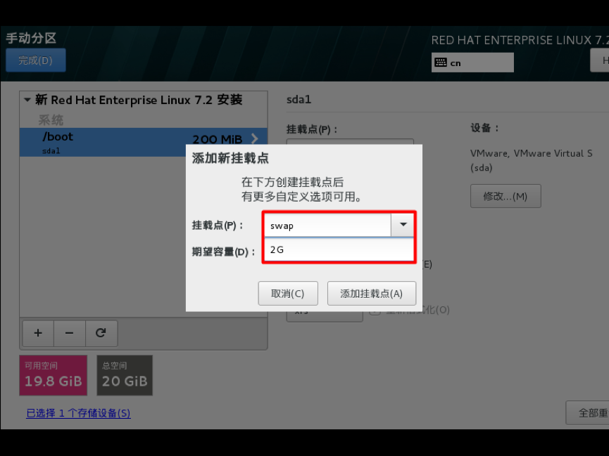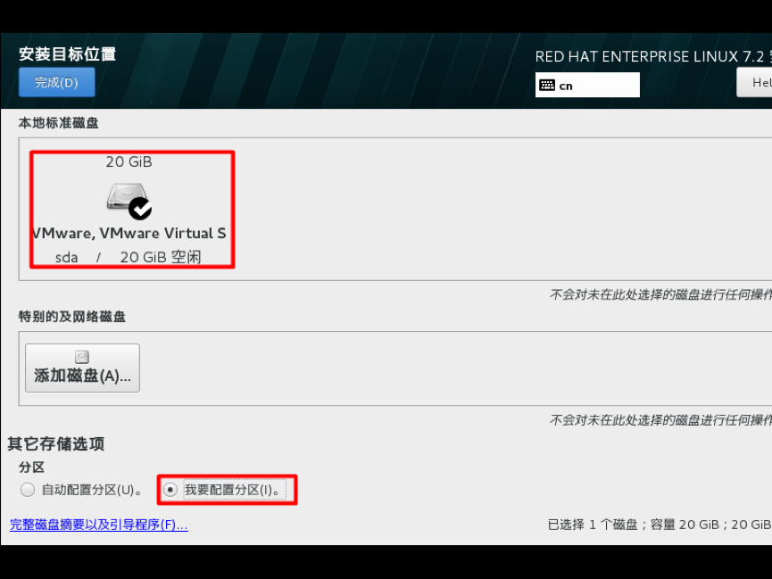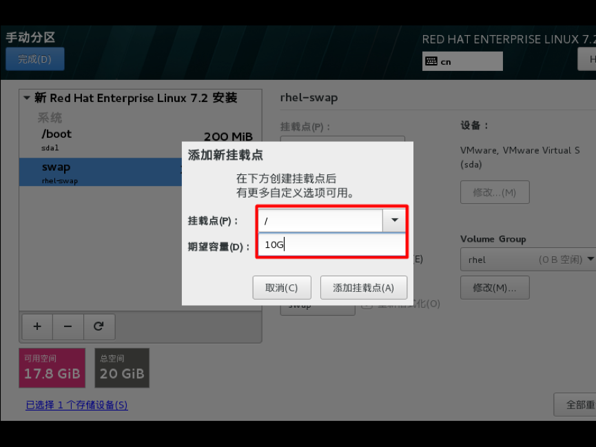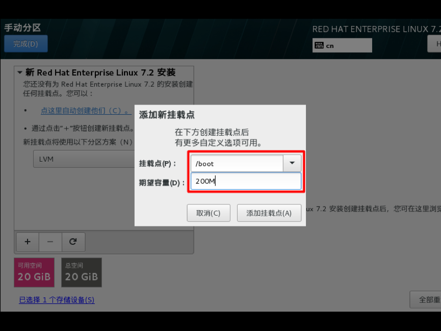 选择-其它存储选项-分区-我要配置分区,点左上角的“完成”,进入下面的界面,在分区方案有标准分区,btrfs,LVM,LVM简单配置,这里默认LVM就可以,然后单击创建新的分区,分区提前规划好,一般swap分区为物理内存的1.5~2倍,/boot分区200M,/分区10G,实际工作中可以创建数据分区,一般把数据和系统分开