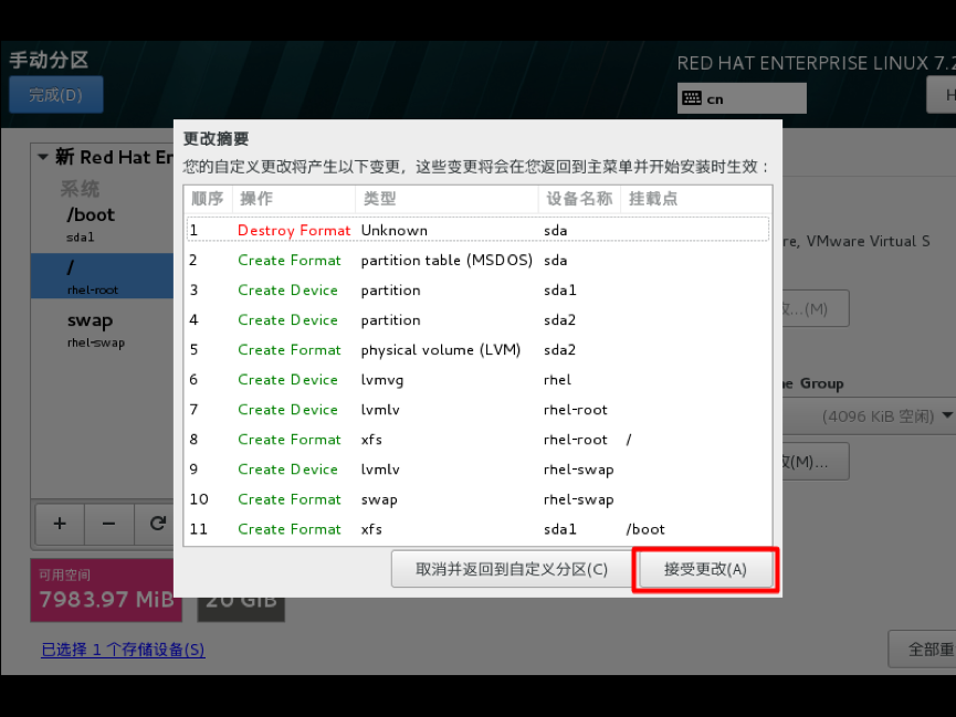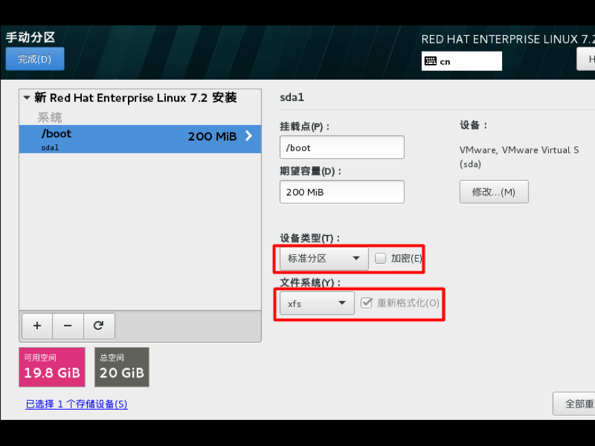 设备类型选择默认的标准分区,文件系统类型为xfs,RHEL7支持brtfs,生产环境不建议选择,btrfs文件系统目前技术尚未成熟,只是作为一种前瞻技术