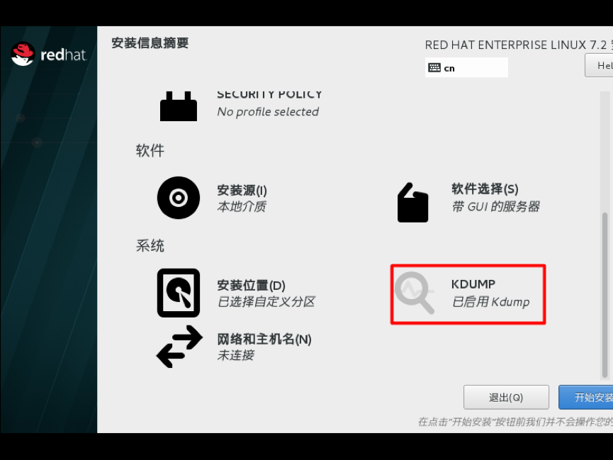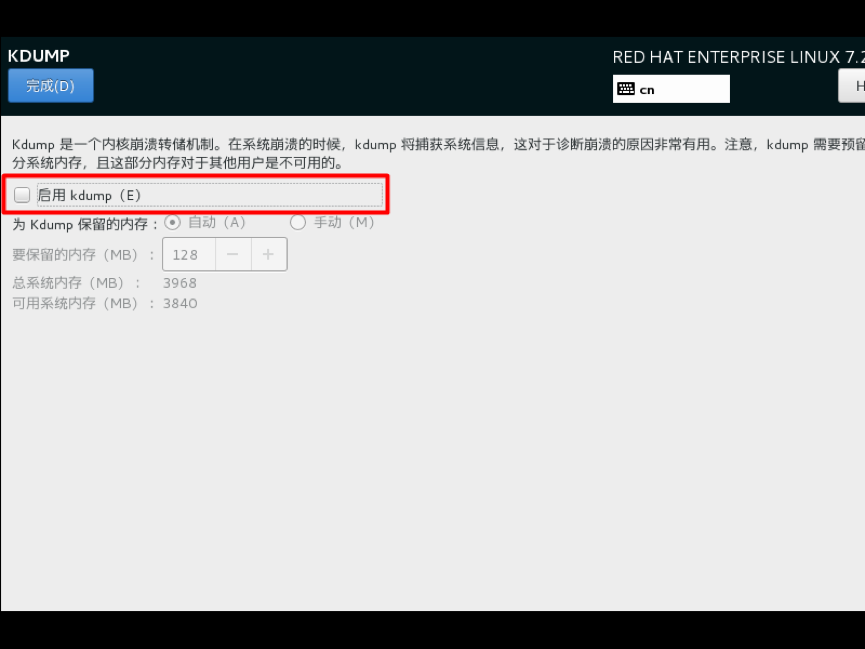 Kdump是一个内核崩溃转储机制,直接关闭即可,单击完成