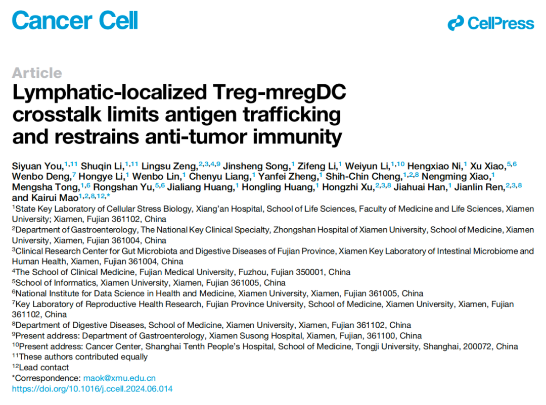 2024年7月18日,厦门大学毛开睿团队在 Cancer Cell 期刊发表了题为: