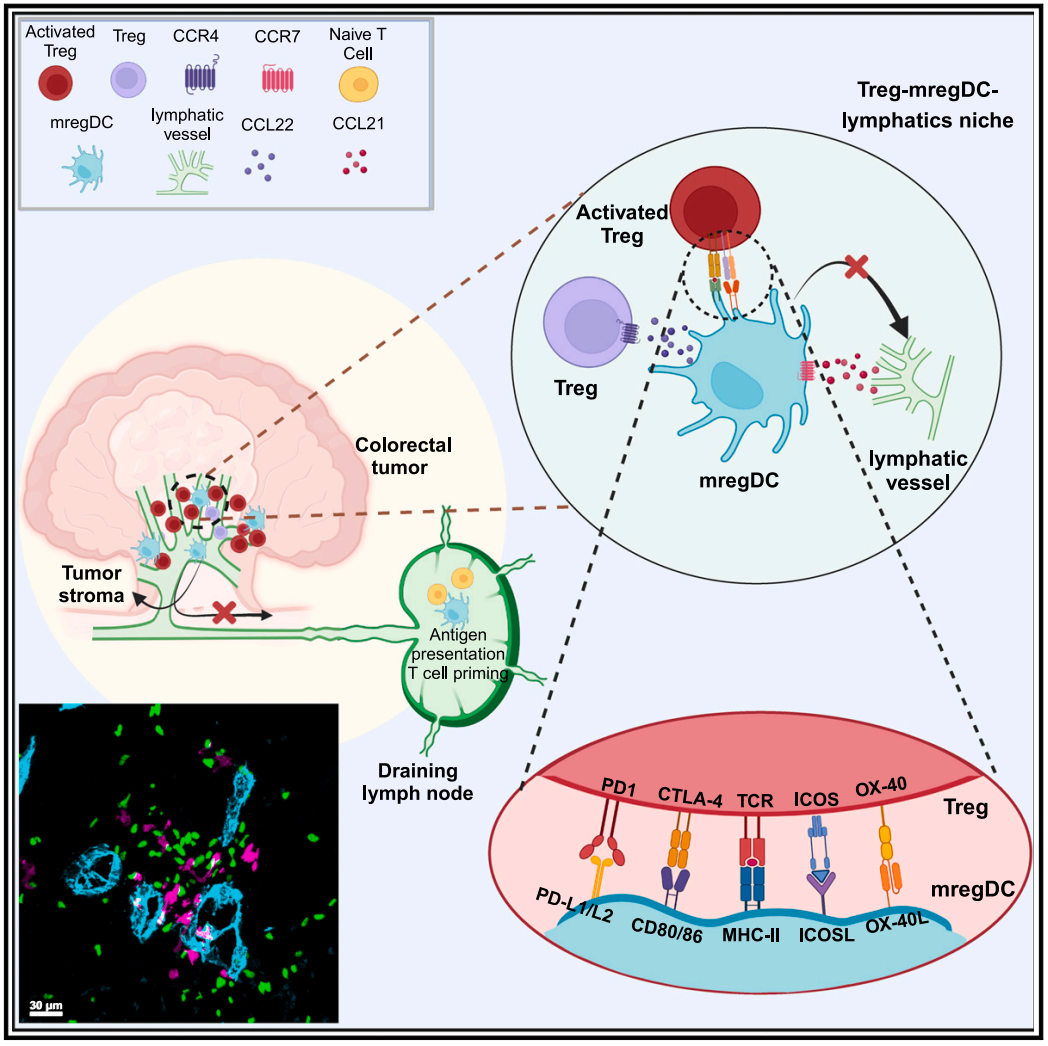 利用先进的多重成像技术,该研究发现,调节性T细胞(Treg)在外周肿瘤基质的淋巴管周围聚集。这种局部聚集是由富含免疫调节分子的成熟树突状细胞(mregDC)促成的,它们促进了Treg的趋化性,建立了一个淋巴管周围的Treg-mregDC微环境——Treg-mregDC-淋巴生态位(Treg-mregDC-lymphatic niche)。